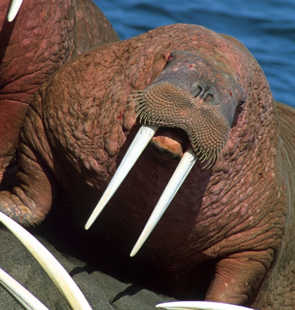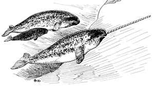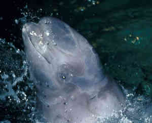 The strange looking Narwhals (pictured above) are also members of the toothed whale (odontoceti) club. But they are not in the dolphin family. They are in the Monodontidae family. The other lonely member of this family is the Beluga whale. Monodontidae are white whales with blunt heads and no dorsal fin. That big spike coming out the whale's forehead is really its left upper tooth. Only males have this "tusk" and no one is quite sure what it is used for. Narwhals live in the arctic and are said to be rare.