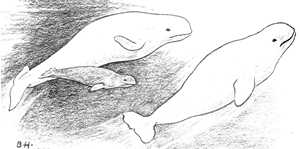 The friendly looking (but not really smiling) cetacean above is a Beluga whale. The drawing below represents a beluga family.