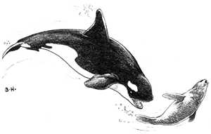 The killer whale above is chasing a seal. Seals are not cetaceans. They are pinnipeds. Seals, sea lions, and walruses are pinnipeds.
