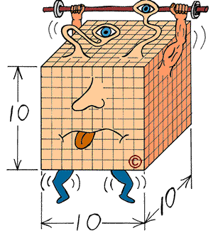 100 times bigger) and his inside volume is 1000 cubes (10 times 10 times 10).
